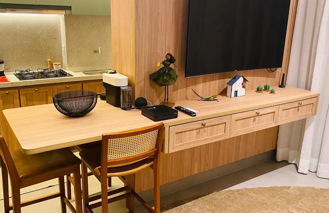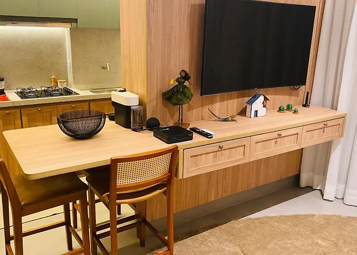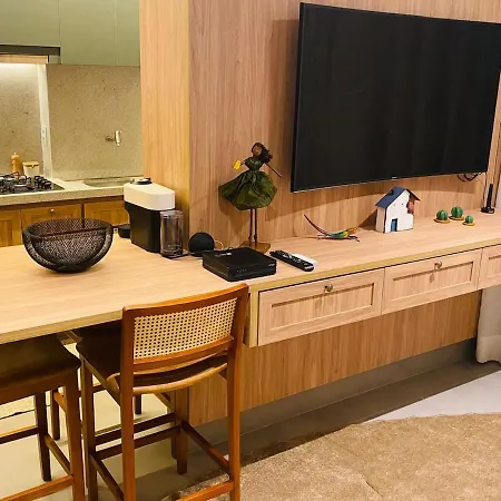 Apto De 2 Quartos E Ar Condicionado Perto Do Praia Clube apartment provides guests with a living room and a fully equipped kitchen, as well as such modern comforts as air conditioning. The accommodation features a bathroom with dryers. Furthermore, a separate toilet and a shower is available.